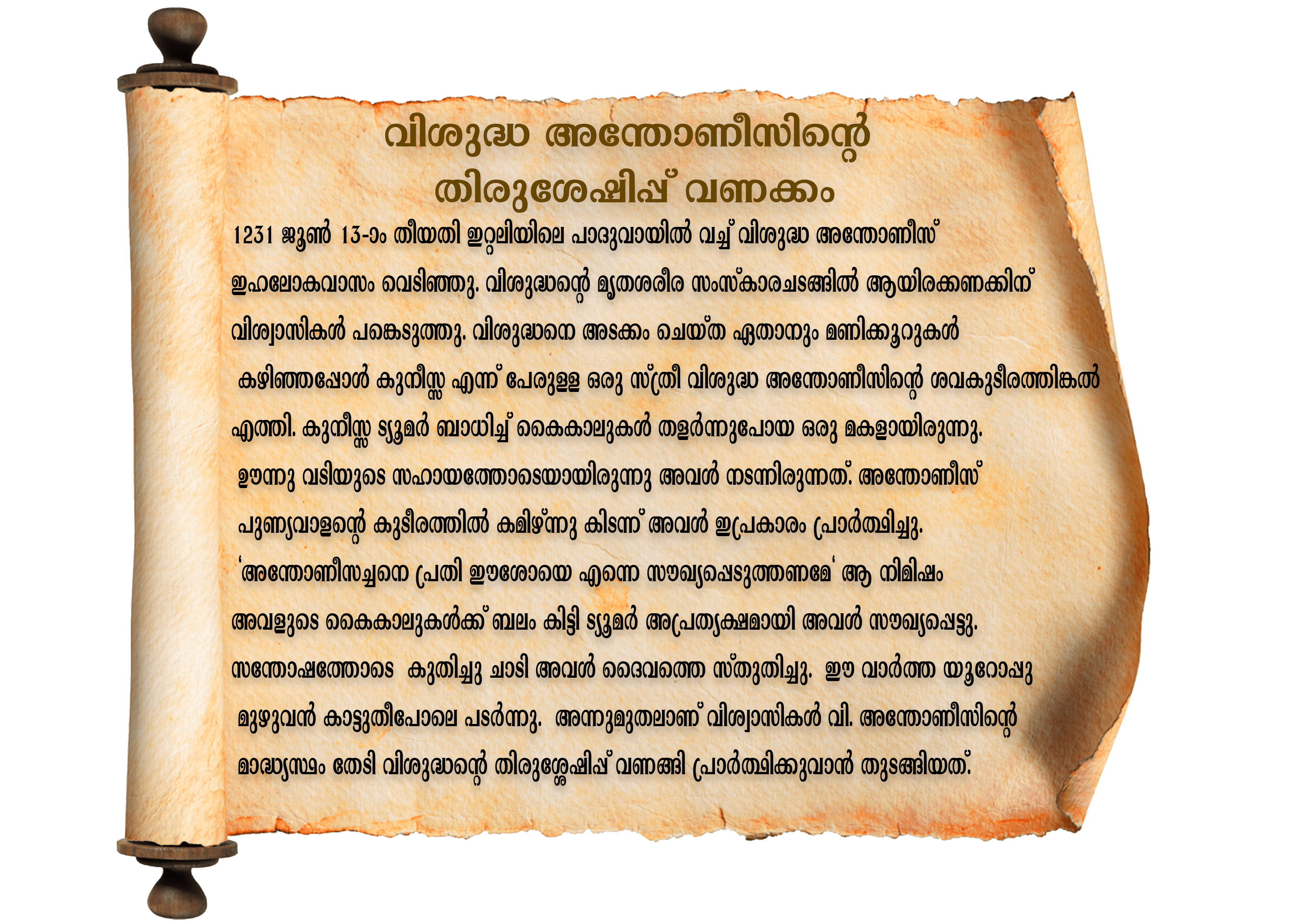 People from all walks of life visit St. Antony Shrine, Koratty for the Veneration of the Holy Relic of the saint. St. Antony left to the heavenly abode from this world on 1 June 1231 at Padua, Italy. Thousands of believers participated in the funeral rites of St. Antony. A few hours after the burial of the saint, a woman named Kunisa came to the tomb of St. Antony. She was a tumour patient and was half paralysed hence she could walk only with the help of a stick. She threw herself at the tomb of St. Antony and prayed, “O Lord in the name of Padre Antony of Padua be kind to heal me”.Suddenly she felt so good that her legs were so strong and her tumour disease had disappeared and she was miraculously healed. She jumped with joy and praised God. Since this news spread in all over Europe believers have begun to seek the intercession of the saint by giving veneration to the Holy Relic to receive blessing from heaven.